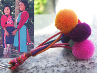 | 素晴らしい伝統技術で彩られた山岳民族の女性の民族衣装はそれぞれ個性豊かです。中でもリス族の民族衣装は飛び抜けてカラフルで、綿の布を細かく縫い合わせて作った長い紐の先に色とりどりのボンボンを100個ほど腰に巻きつけてしっぽのように垂らし後姿を飾ります。何だか後ろからピュッピュッと引っ張りたくなりますね。この紐は1日に10本しか出来ずこれを作る為には長年培った技術が必要だそうです。ところでこの紐の先についている可愛らしいボンボンをキーホルダーにしたのが好評なのです。このボンボンがついたキーホルダーは鍵をつけるだけではなくバッグやポーチのチャックの部分につけると引っぱりやすくアクセントにもなります。以前にご紹介したリス族のポーチは原色の色とりどりの布を何枚も重ね縫いしアップリケの層を作った凝った物でしたが、今回ご紹介するのは黒地に手織りの布をはさんで仕上げたポーチです。黒地に織柄が映えてとてもシックです。この織柄はキーホルダーのボンボンを束ねているのと丁度同じなのでこのポーチにつけると本当にぴったり!このボンボンキーホルダーをつけて大小Setでプレゼントされると喜んで頂ける事でしょう。 |